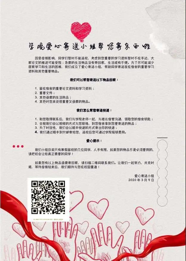 在威尼斯9499登录入口党委的号召下,各师生支部鼓励支部成员积极参与疫情防控工作,为抗击疫情做力所能及的事,尽一份自己的力量。面对新冠疫情下滞留湖北师生口罩资源匮乏的情况,威尼斯9499登录入口积极联络,给他们寄送口罩。3月初,在威尼斯9499登录入口党委号召下,在校学生党员积极行动起来,成立威尼斯9499登录入口爱心寄送小组,帮助不在校的同学,尤其是毕业班同学寄送必需物品。小组共完成23次物品寄送,缓解了部分同学的燃眉之急,受到了老师与同学的好评。学校党委下发《关于组织党员自愿捐款支持新冠肺炎疫情防控工作的通知》,威尼斯9499登录入口师生党员积极响应号召,爱心助力,自愿捐款,为奋战在“抗疫”一线的医护人员表达了温暖的问候和崇高的敬意。