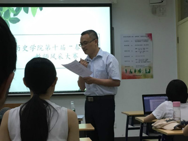 随后,两位学生评委和马卫东老师对选手们进行了点评。李皎乐同学点评大家都做到了史料详实、论从史出,逻辑清楚,PPT做得很现代化,但字过多,历史课讲课应富有激情,还应适量板书课程结构。肖雪同学对选手一一进行了点评,窦芳丽同学讲课速度比较合适,可以把问题先提出来;刘晓月同学的课程设计非常好,可以多带同学自己找出答案;李筱艺同学讲得比较深入浅出,但设置的问题较大;于晓冉同学和学生互动自然,设置问题合理;钟传永同学讲得非常有意思,但还要契合一些关键知识点。马卫东老师肯定了选手们作为优秀历史教师的潜质,并建议大家只讲一个子目,课件文字不能太多,史料和图都要能引领学生阅读。马老师最后还讲到历史的基础教育应从课标入手,收集包括教科书在内的各种资源,迅速组合,建构自己的教学,通过教学引领学生认识历史而不是教科书,给在场的选手和观众以很大的启发。