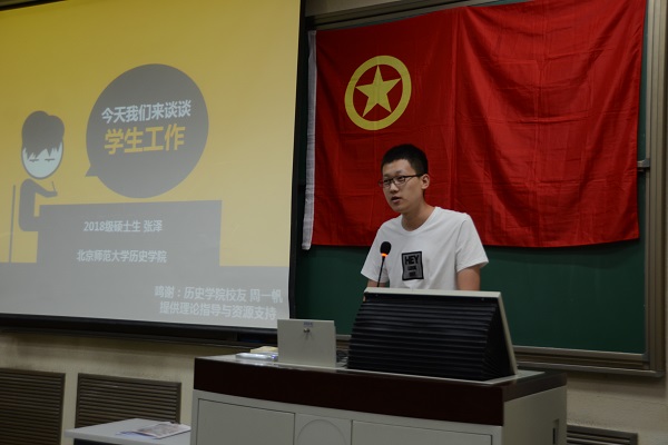 开班仪式结束之后,培训活动正式展开。主讲人张泽以“什么是学生工作”、“为什么要做学生工作”、“怎样做好学生工作”和学生工作纪律问题为重点,向同学们详细介绍了院内五大学生组织及其主要工作。随后,在“怎样做好学生工作”方面,张泽以风趣幽默的语言与大家分享了自己本科阶段学生工作的经验与感受,并与同学们进行互动交流,这为刚入大学、不知如何平衡工作与学习时间的大一新生提供了帮助。在培训最后,张泽主要强调了学生工作的纪律问题,并提醒同学们要遵守法律法规与学校纪律。
