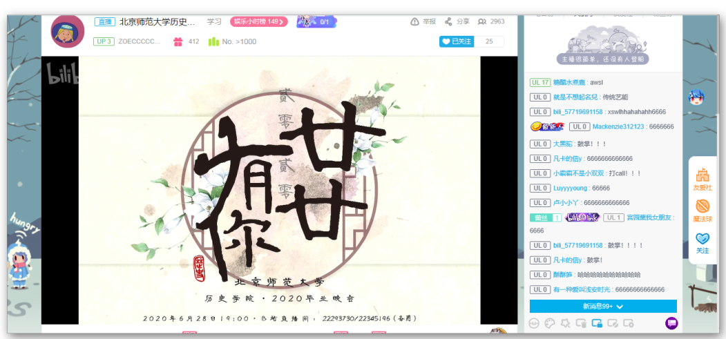 2020年6月28日晚19:00,威尼斯9499登录入口2020届“廿廿有你”毕业晚会在哔哩哔哩平台成功举办。晚会时长近两个半小时,直播人气峰值达到3000以上,为观众们呈现了一场精彩、难忘的视觉盛宴。