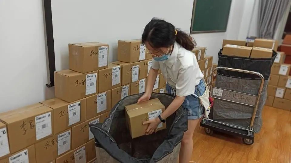 装箱完毕,后勤的师傅将行李一件件地从寝室楼搬运至快递点处,由学生志愿者进行邮寄。