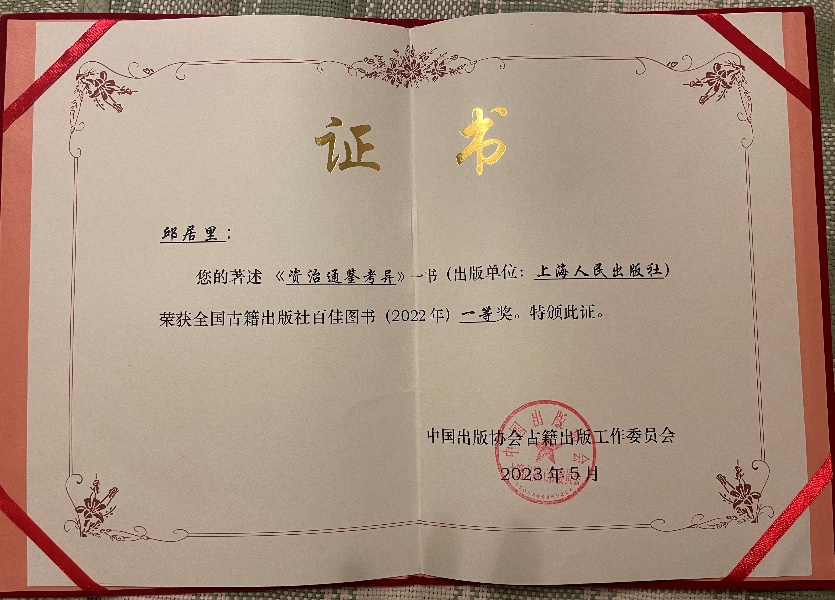 由历史学院“文化遗产与文化传播”建设项目资助、古籍所邱居里教授点校、上海人民出版社2022年10月出版的《资治通鉴考异》一书荣获全国古籍出版社百佳图书(2022年)一等奖。