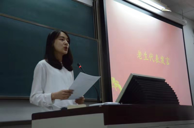 2016级本科生张墨润、2017级硕士研究生宣柳作为老生代表发言。张墨润详细回顾了本科期间的学术科研与学生工作经历,阐述做好准备并且持之以恒地努力的重要意义。宣柳同学从寻找兴趣早做准备、开拓学术视野、勤学苦练三个方面分享学习经验,鼓励同学们抓紧用功。