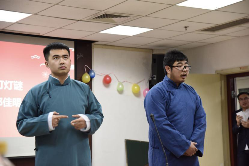 第二阶段的表演继续。靳悦、丁一丹同学带来爵士舞《Whistle》,舞姿优美,富有活力。张永榜同学带来小曲儿《探清水河》,老师同学们仔细聆听并报以热烈掌声。随后,2018级本科生马楚雨同学带来二胡名曲《赛马》,宛转悠扬、极富感染力。郑佳明、郑绍健同学配合默契带来相声《打灯谜》,给现场带来阵阵笑声。