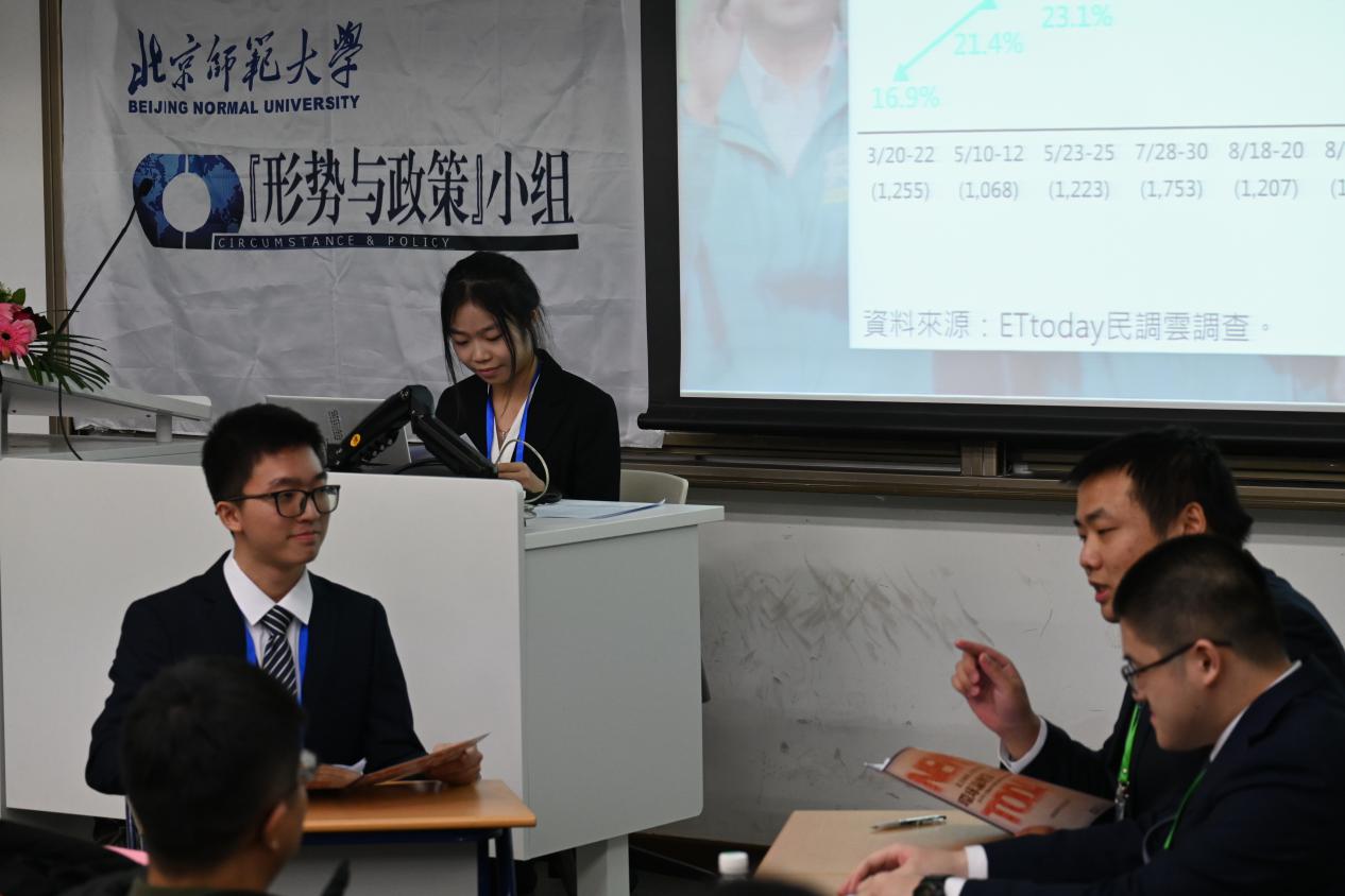 第三组代表、2022级哲学学院本科生杨佑等同学以模拟《海峡两岸》节目的形式展示主题《“蓝柯一梦”——“蓝白合”破局探析》。同学们分别饰演《海峡两岸》“代班主持人”、“邢予正时事评论员”等角色,围绕2024台湾地区领导人选举进行讲解分析。他们创造性地借用电视节目形式,首先介绍了台湾地区以国民党、民进党和民众党为代表的“蓝”“绿”“白”三股政治力量,又从岛内蓝白双方互补性和合作的潜在空间等角度重点介绍了“二对二幕僚磋商会”“马办会”“君悦会”等重要节点事件。威尼斯9499登录入口世界近代史教研室贾珺副教授充分肯定了本组的选题的立意价值与生动形式,辩证分析了蓝白合作破裂的局面,引导大家通过对台湾地区时事的深入观察,达到筑牢知识基础、加强独立思考的自我培养目标。
