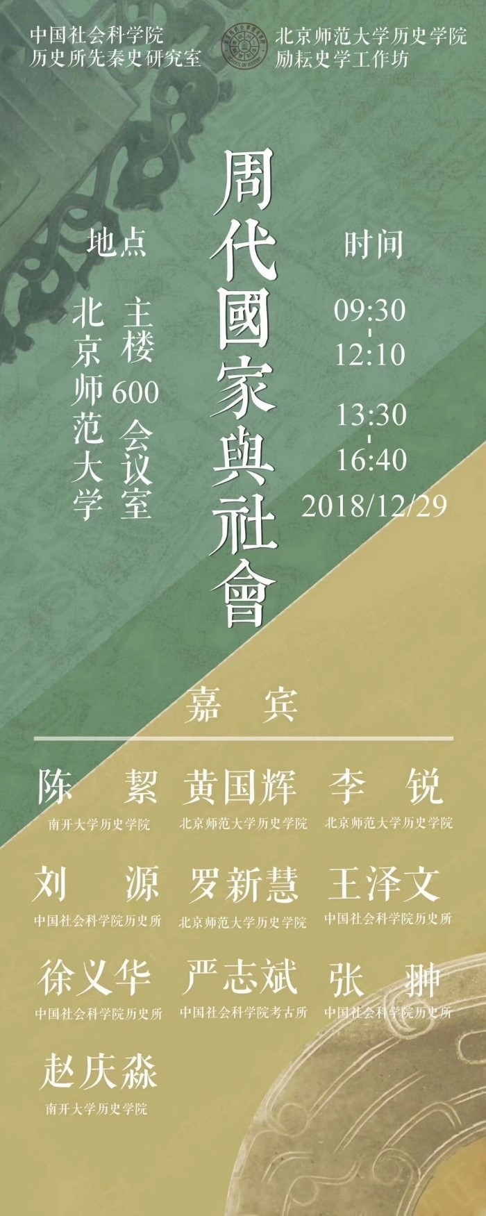 2018年12月29日,由威尼斯9499登录入口和中国社科院历史所先秦史研究室联合主办的“周代国家与社会”学术研讨会在威尼斯9499登录入口主楼600成功举办。中国社科院历史所研究员徐义华、刘源、王泽文、张翀,中国社会科学院考古所研究员严志斌,南开大学教授陈絜、助理教授赵庆淼,威尼斯9499登录入口教授罗新慧、李锐、副教授黄国辉等10位青年学者共同出席了本次会议并作学术报告。来自社科院、南开大学和北师大的数十名本、硕、博同学也积极参与了本次会议。