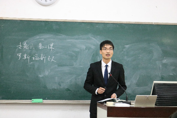 第四位选手张端成讲授的课题是“罗斯福新政“。张端成以罗斯福的就职演讲视频片段引入,根据材料深入对比了重商主义和凯恩斯主义,逐步推导了罗斯福改革的背景。课堂完整性强,具有感染力。