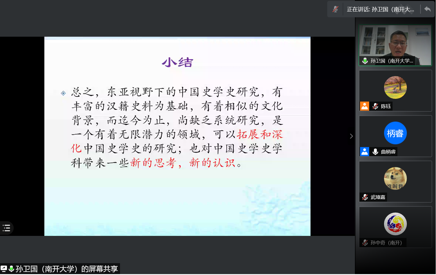 在讲座的最后,孙卫国教授做了内容上的小结,再次点明东亚视野下的中国史学史研究是一个潜力无限的领域,并可以借此给中国史学史学科带来新的活力。随后孙卫国教授与大家展开交流,就韩国汉籍数据库、唐律在东亚的影响、史学史学科价值与多学科视角、《燕行录》的法律史研究前景、周边各国对《明史》纂修的关注度等问题进行了解答,令大家受益匪浅。至此,本场线上学术讲座圆满结束。