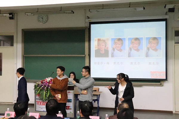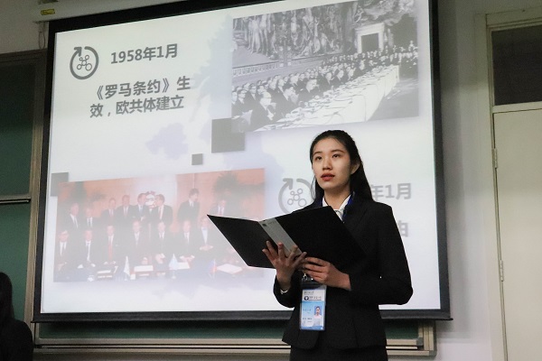 第一组代表、威尼斯9499登录入口2018级王冰同学展示的主题是《英国脱欧——难以出鞘的双刃剑》。她向观众们娓娓道来,从英国脱欧的历史渊源讲到目前脱欧的主要进展与面临的困难,并以视频的形式展示了英国政府在脱欧问题上可能面临的四种情况。她指出:英国脱欧的背后既有传统孤立的价值观意识影响,又有当今盛行的民粹主义思潮推动;既有精英阶层的个人利益诉求在背后作祟,又有基层民众不理性的政治参与推波助澜,英国的未来最终只能由英国人自己决定,而回归理性才是解决问题的真正途径。该组展示融入了极富新意的情景剧,几位同学生动有趣的表演让观众们更加直观地理解了英国脱欧的困难之处,也使现场的气氛更加轻松愉快。