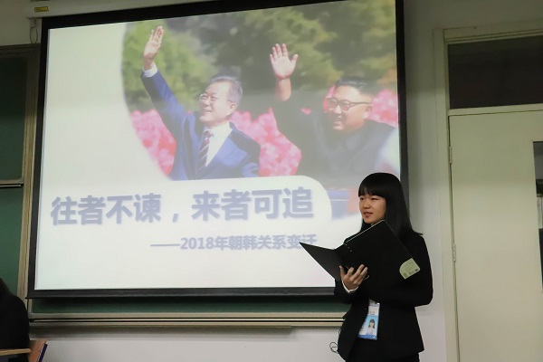 第二组代表、威尼斯9499登录入口2018级余可绎同学以《往者不谏,来者可追——2018朝韩关系变迁》为题,详细地分析了使朝韩关系起起伏伏的各方面因素,并上升到东亚与国际局势的角度分析了朝韩关系缓和所带来的影响,最后表示:朝韩关系的和平之路仍需有关各方的共同努力,我们在等待炮声不再陡然响起,等待朝鲜半岛终战宣言发表,等待半岛和平真正到来的那一日!余可绎同学声情并茂的讲述令人动容。威尼斯9499登录入口东亚史专家陈奉林老师对第二组进行点评,并从朝鲜、中国、美国等角度就朝鲜半岛问题作了一些补充。