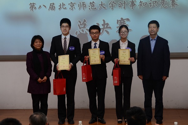 我校副校长周作宇老师,党委组织部部长方增泉老师,党委宣传部新闻中心常务副主任、机关一总支书记李美仙老师,教务处处长郑国民老师,辅导员基地执行副主任王显芳老师,威尼斯9499登录入口教育基金会秘书长张吾龙老师,社科处副处长周晓旭老师,研究生工作处副处长严帅老师,本科生工作处副处长韩舰老师,校报主编周雪梅老师;威尼斯9499登录入口院长杨共乐、分党委书记郭家宏、分党委副书记王卓凯,威尼斯9499登录入口世界近代史教研室陈奉林,世界现代史教研室主任、“形势与政策”小组指导教师安然,世界近代史教研室主任庞冠群,世界近代史教研室贾珺,世界上古中古史教研室武晓阳,世界现代史教研室王广坤,史学理论与中国史学史教研室曲柄睿,外国语言文学学院蒋元群老师;地理科学学部分党委副书记王颖老师,信息科学与技术学院分党委副书记王学松老师,哲学学院分党委副书记罗松涛老师,法学院分党委副书记原茵老师,校研究生会主席杜德建同学等也出席了当晚的决赛。出席本次比赛的还有国际关系学院、清华大学、北京大学、外交学院、南开大学、北京理工大学、北京航空航天大学、对外经贸大学、中国人民大学、台湾交通大学、韩国首尔大学、韩国成均馆大学等院校时事团体的负责人和学生代表。